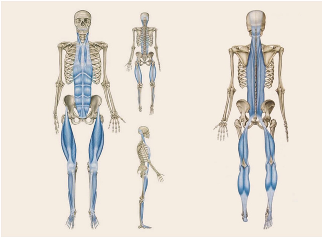Te „taśmy” (czyli niebieskie linie zaznaczone na obrazku) to system połączonych mięśni, powięzi i struktur w naszym ciele. Można je porównać do rusztowania, które pomaga nam się poruszać, utrzymywać postawę i balansować.
